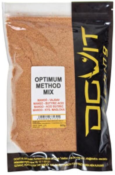 Az Optimum Method Mix egy halas alapra helyezett, kifejezetten gyorsan dolgozó, magas minőségű keverék, amivel elsősorban a pontyokat és kárászokat érdemes megcélozni, method végszerelékkel. Vízbe érve gyorsan kezd oldódni, és látványos füsttel, valamint intenzív aromákkal vonzza magához a célhalakat. A hagyományos felhasználáson túl, intenzitása tökéletesen alkalmassá teszi method pelletek panírozására is.