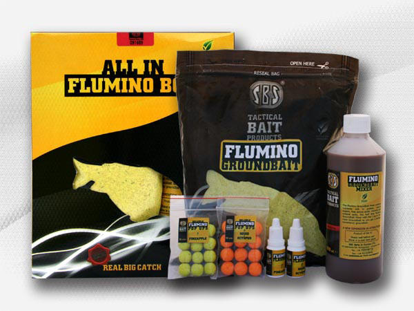 Az SBS All In Flumino Box F-code komplett csomag tartalma: 1 kg többféle hallisztet tartalmazó Flumino Groundbait F-code etetőanyag, 500 ml Flumino Groundbait Mixer, és 1-1 tasak Cranberry (áfonya - narancsszínű) és Black Squid (fekete tintahal – sötétbarna színű) 10 mm-es Pop Up horogcsali, valamint 2x2 ml aroma Cranberry és Black Squid ízesítésekben.